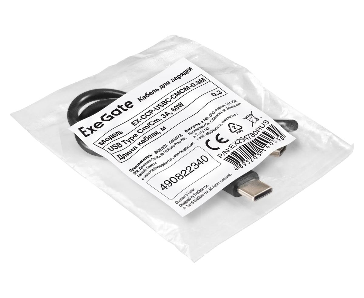 Кабель для зарядки ExeGate EX-CCP-USBC-CMCM-0.3M EX294780RUS USB Type Cm/Cm 3A 60W 0,3м