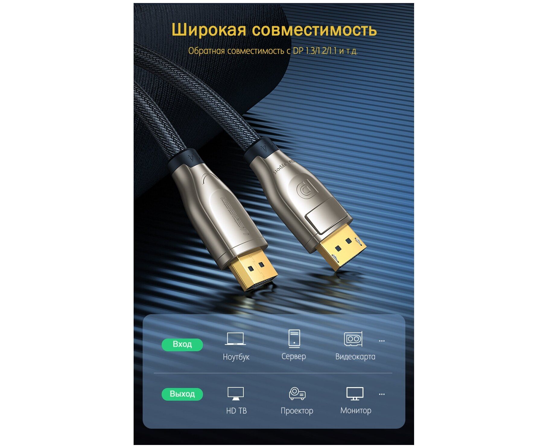 Кабель UGREEN DP112 60843 1.4 DP M/M Round Cable Zinc Alloy Shell with Braided 2m Black