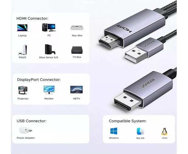Кабель UGREEN HD169 (55329) HDMI to DisplayPort 4K 60Hz Cable 2m Gray