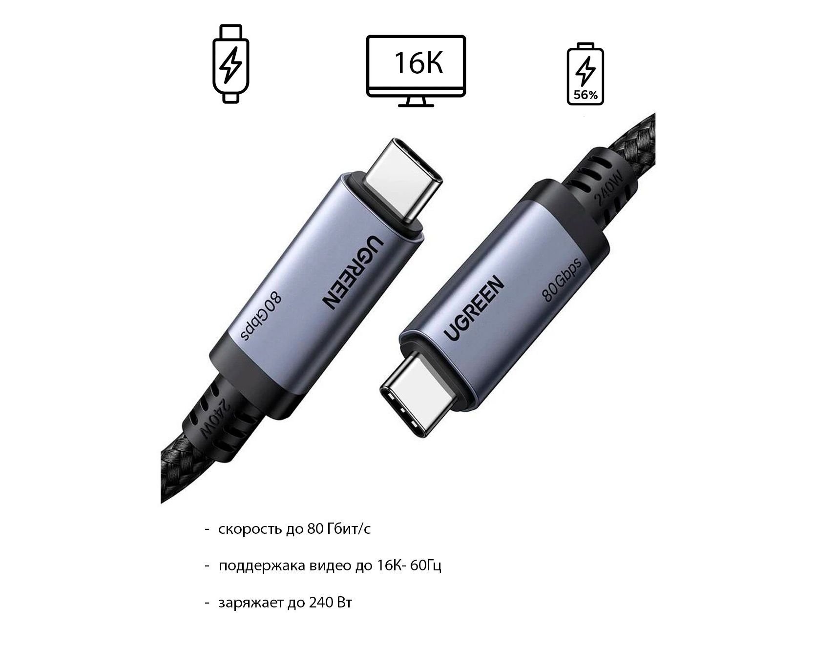 Кабель UGREEN L706 (65383) 240W 80Gbps USB-C to USB-C GEN4 Charging Cable 5A Max 1m Gray