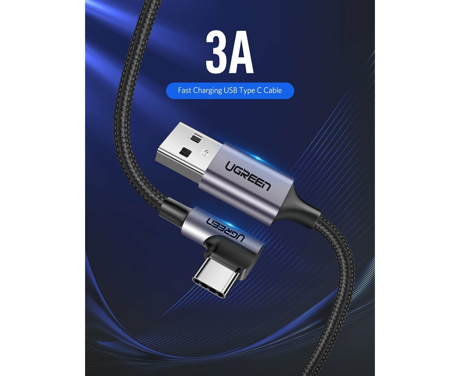 Кабель UGREEN US284 70255 Angled USB-C Male To USB2.0 A Male 3A Data Cable 90°Angle 3m Black