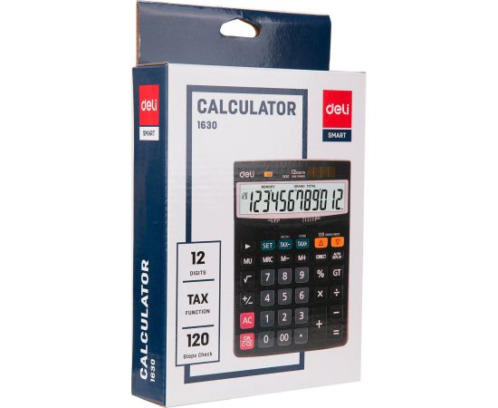 Калькулятор настольный, E1630, 188x140 мм, черныйБухгалтерский калькулятор Deli 1630 настольный в пластиковом корпусе с 12-разрядным ЖК-дисплеем. Имеет оптимальный набор вычислительных функций: основные математические операции, расчет процентов, извлечение квадратного корня, запоминание промежуточных результатов, вычисление налога и наценки. Позволяет корректировать введенное число. Удобная клавиатура снабжена кнопкой ввода двойного нуля. В калькуляторе имеется два источника питания. Размеры: 188х140х44 мм. В комплекте 1 батарейка LR44. 2VTB13
