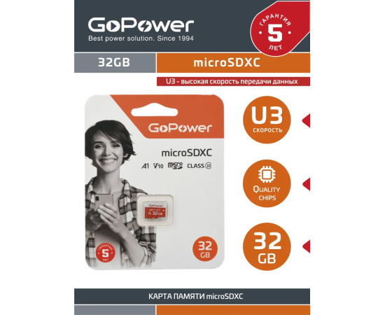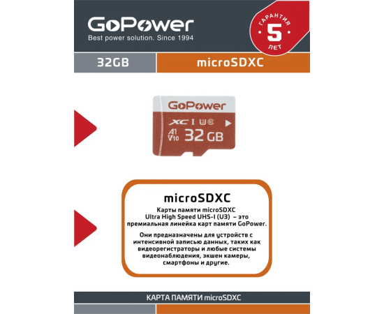 Карта памяти GoPower 00-00025680 microSD 32GB Class10 UHS-I (U3) 80 МБ/сек V10 без адаптера