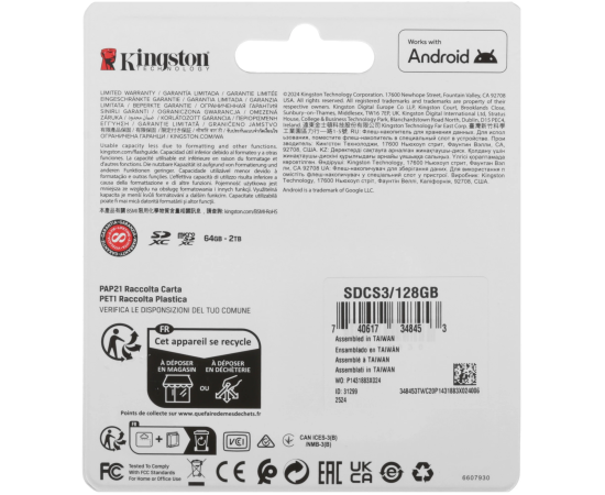 Карта памяти Kingston microSDXC 128 ГБ [SDCS3/128GB] соответствует классам скорости A1, UHS Class 1 и Video Class 10. Изделие предназначено для смартфонов, фотокамер и других устройств.