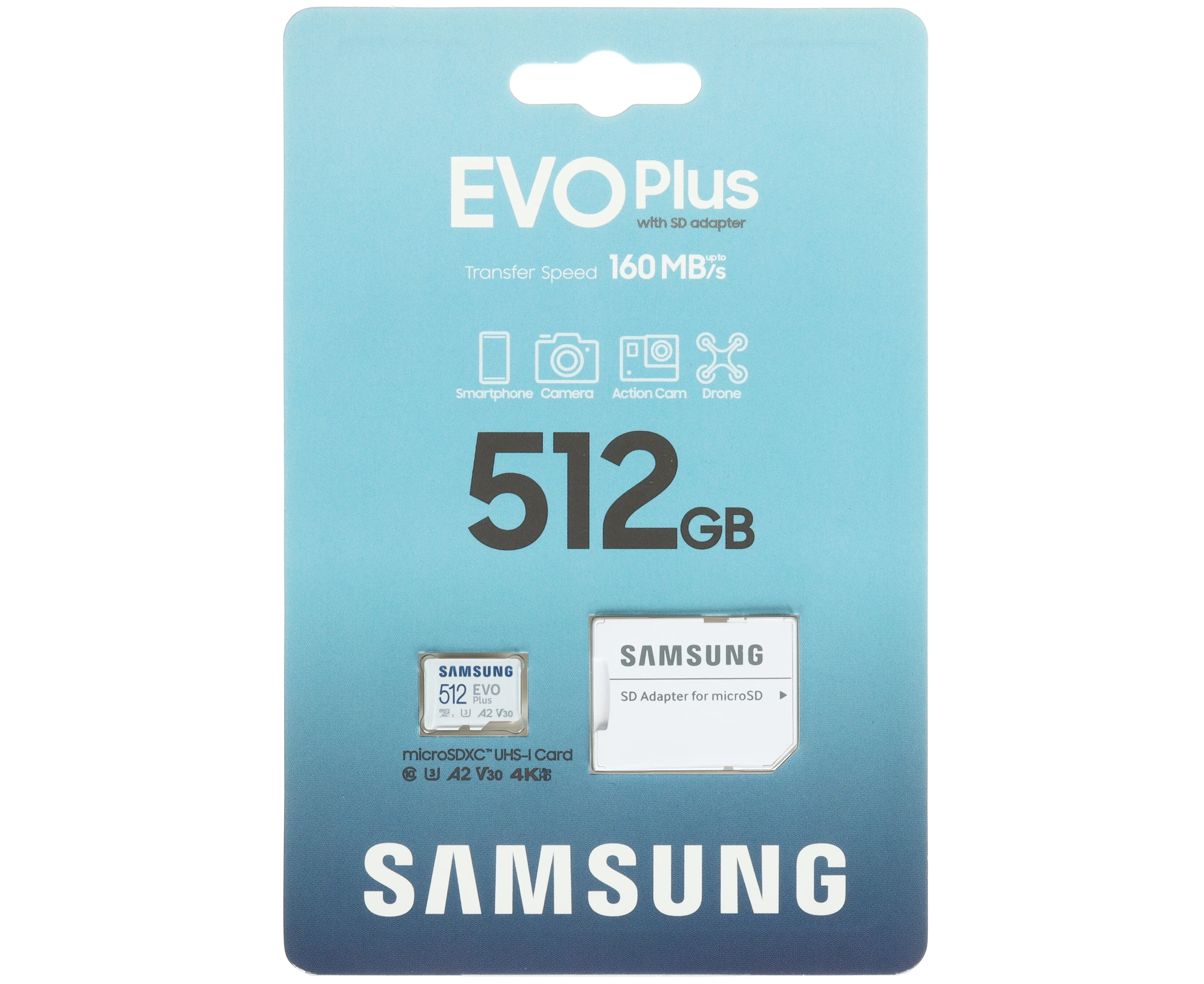 Карта памяти Samsung EVO Plus microSDXC 512 ГБ [MB-MC512SA/KR] типа microSDXC позволяет записывать и хранить данные общим объемом 512 ГБ. Классы A2, UHS Class 3 и Video Class 30 обеспечивают чтение с максимальной скоростью 160 Мбайт/сек.