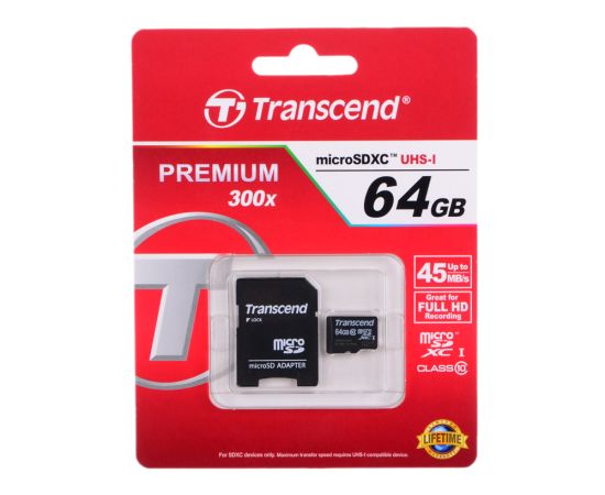 Карта памяти microSDXC Transcend, 64 Гб, UHS-I Class U1, чтение: до 45Мб/с, с адаптером