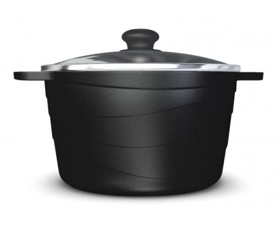 Кастрюля имеет современный прямой корпус из литого алюминия с уникальным геометрическим рисунком «волна».