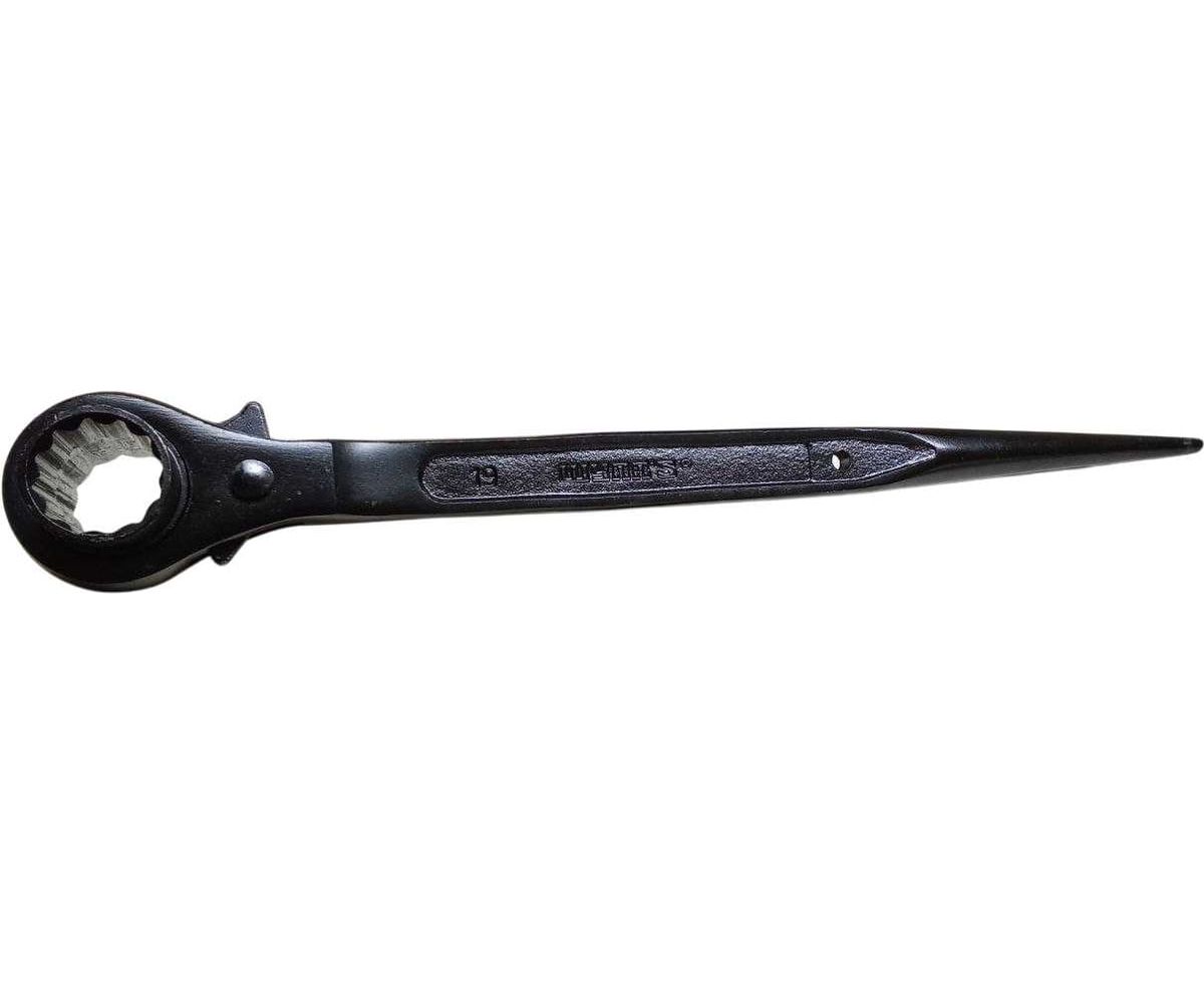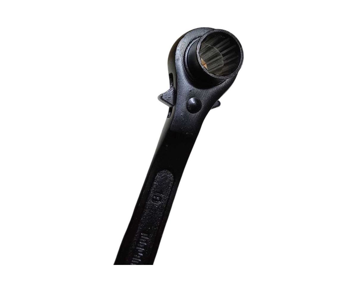 Ключ коликовый с трещоткой и переключателем представляет собой двусторонний инструмент для откручивания ступичных гаек. Ключ монтажный трещоточный подходит для бытового и профессионального использования - в гараже, автосервисах, мастерских. Торцевой двухсторонний ключ с трещоткой применяется для совмещения отверстий и завертывания гаек и болтов при монтаже сборных стальных конструкций, сборки резьбовых соединений технологического оборудования, трубопроводов и для ремонтных работ. Ключ имеет две рабочие 12-гранные головки с переключателем и с храповым механизмом.