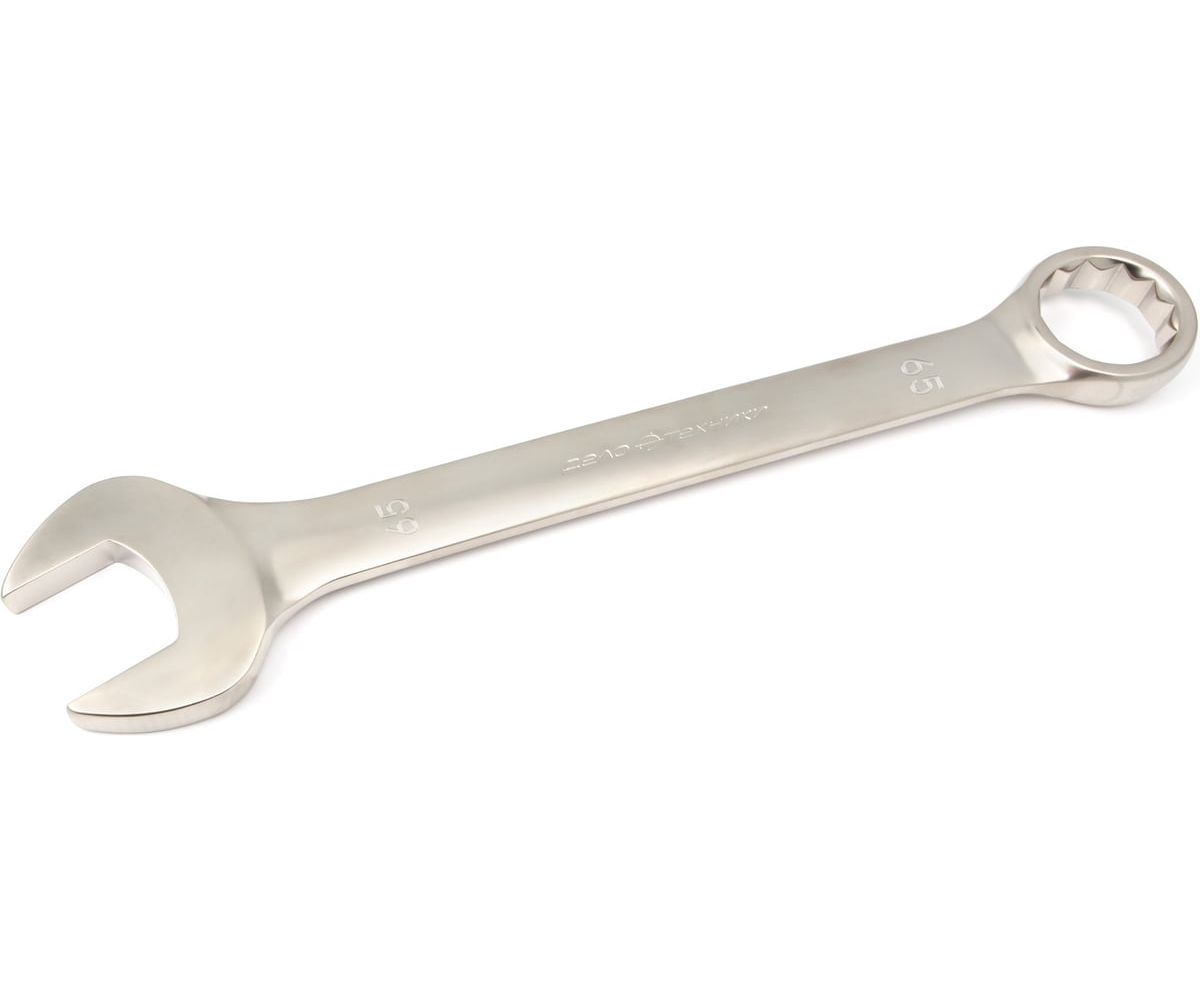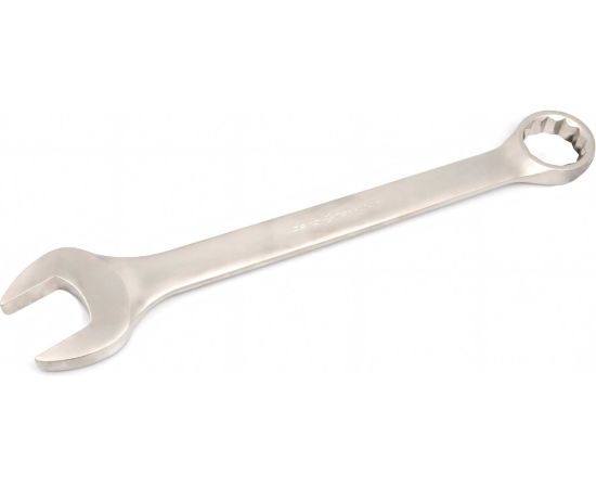 Классический вариант комбинированного гаечного ключа с рожковым профилем на одной стороне и двенадцатигранным накидным профилем на другой. Комбинированный ключ является самым распространенным вариантом гаечного ключа т.к. совмещает в себе возможности рожкового и накидного профилей. Накидной профиль отведён от продольной оси тела ключа на 15° это позволяет работать в ограниченном пространстве. Точность изготовления 12-гранного накидного профиля сводит к минимуму вероятность слизывания граней крепежа. Угол наклона рожковой части относительно продольной оси тела ключа — 15°, что позволяет довести минимальный угловой шаг при работе в труднодоступных местах до 30°. Размер: 65 мм Длина: 705 мм Сталь: 6140CrV Твёрдость: 44—48 HRC Никелирование
