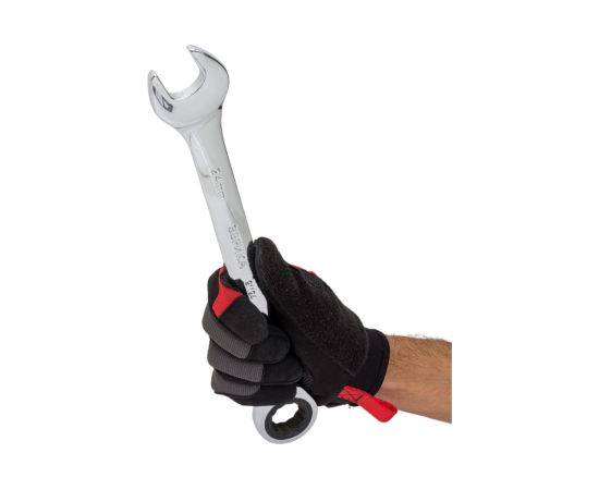 Рожковая и накидная головки обеспечивают доступ к болтам и гайкам сбоку и с торца. Трещотка уменьшает количество действий при вращении ключа и ускоряет работу.