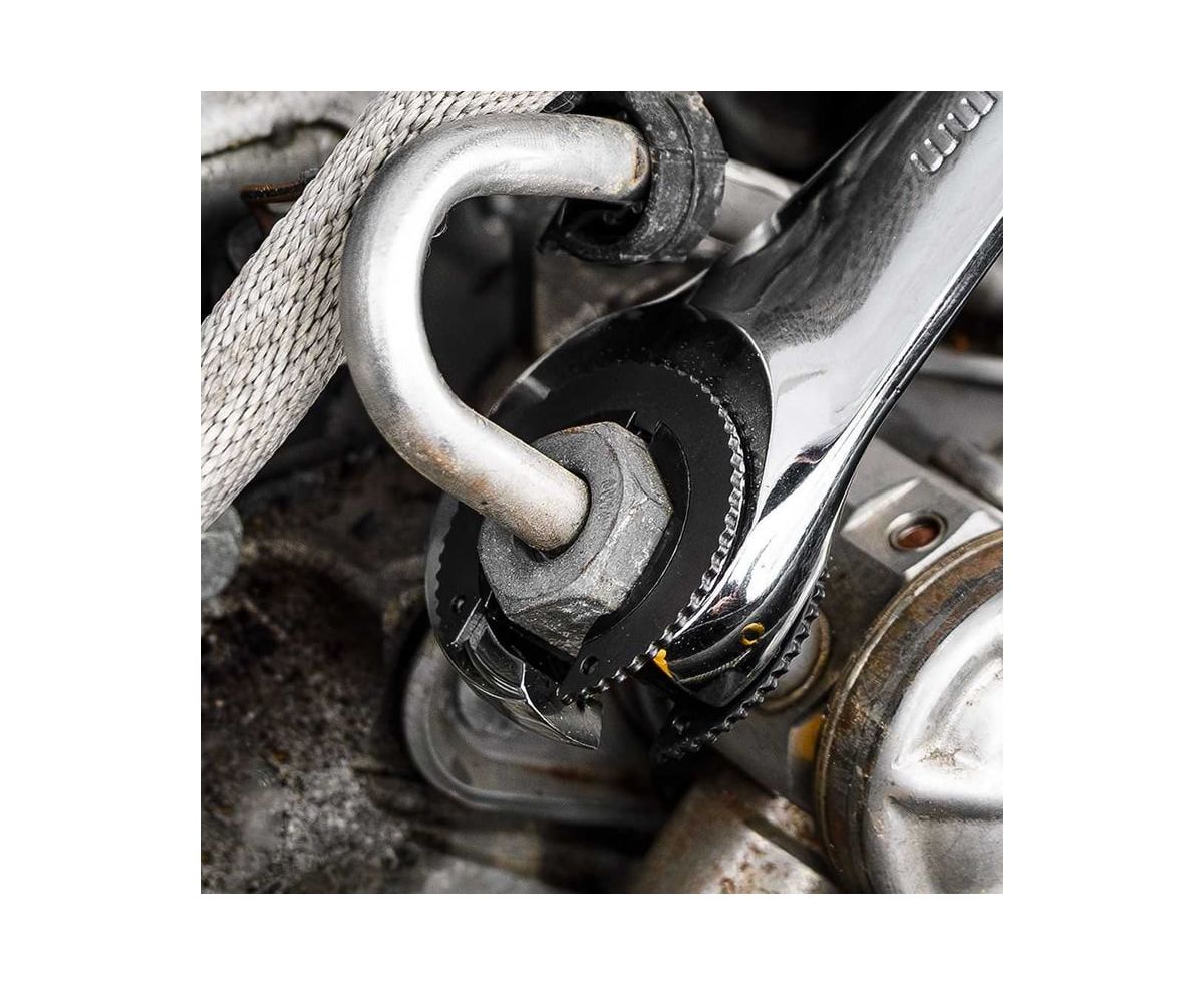 Ключ идеально подходит для установки и снятия гаек крепления топливной и тормозной систем и других узлов. Его компактная конструкция позволяет легко работать даже в труднодоступных местах, где традиционный инструмент может не справиться.
