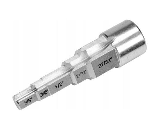 Размеры ступенчатого ключа: 3/8 дюйма (9,6 мм) / 29/68 дюйма (11,6 мм) / 1/2 дюйма (12,6 мм) / 21/32 дюйма (16,4 мм) / 27/32 дюйма (21 мм) с 1/ 2-дюймовый привод изготовлен из высококачественной стали CRV. Имеет с обеих сторон насечки, предназначенные для винтовых соединений с выступами.