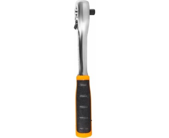 Ключ-трещотка предназначена для быстрого и эффективного закручивания или откручивания крепежа. Инструментом удобно пользоваться в условиях ограниченного пространства, когда нет возможность выполнить полный оборот вокруг грани. Используется в быту и при авторемонте. Рабочая часть изготовлена из CR-V стали и обладает особой прочностью. Хромированное покрытие надежно защищает трещотку от коррозии. Трещотка снабжена механизмом быстрого сброса насадок, что ускоряет процесс работы. Двухкомпонентная рукоятка не выскальзывает из ладони. Трещоточный 72-зубцовый механизм обеспечивает плавность хода, а малый угол поворота в 5 градусов позволяет работать в ограниченном пространстве. Наличие в трещотке храпового механизма обеспечивает быструю смену направления вращения и упрощает работу в труднодоступных местах