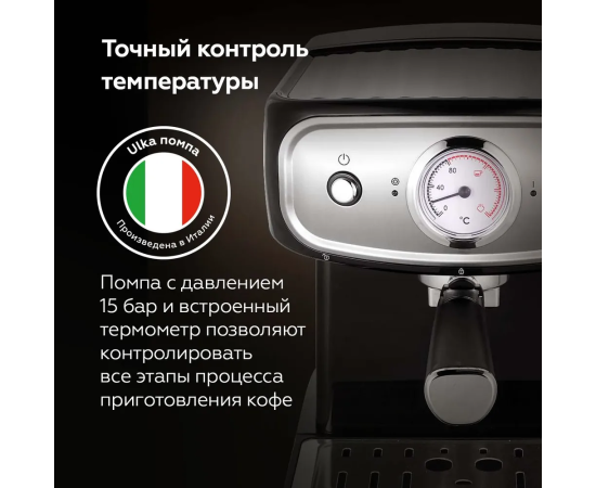 Сочетание в кофеварке мощности 850 Вт и итальянской помпы ULKA создающей давление в 15 Бар передадут весь аромат кофе.