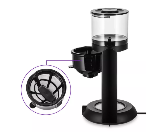 В капельной кофеварке вода доводится до температуры 80–90 °С, после чего медленно поступает в фильтр с молотым кофе. Пройдя через него, она попадает в кофейник. Кофеварка оснащена многоразовым нейлоновым фильтром, который удобно мыть и использовать снова.