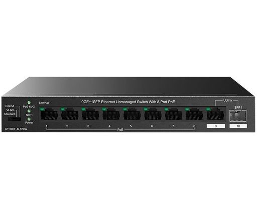 Коммутатор IP-COM G1110PF-8-120W неуправляемый PoE, 10 портов, 9x1 Гбит/с, SFP 1х1 Гбит/с, PoE 8х30 Вт (до 102 Вт)