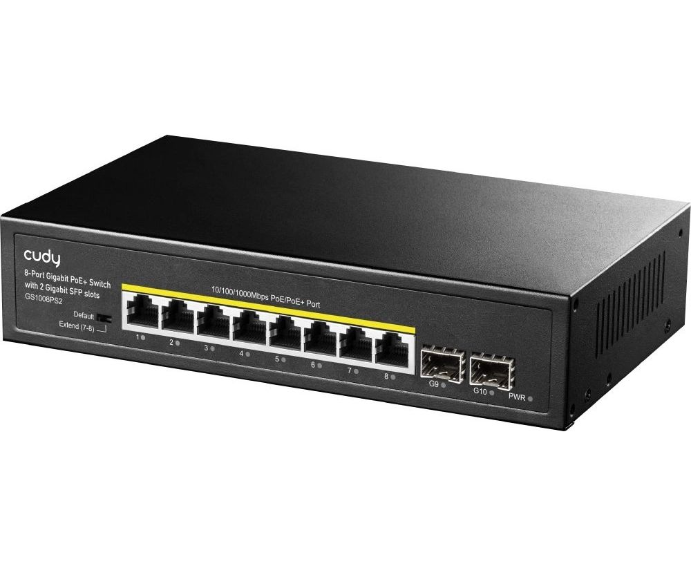 Особенности Cudy GS1008PS2-это неуправляемый L2 коммутатор с 8 портами РоЕ/PoE+(10/100/1000 Мбит/сек)мощностью суммарно до 120 Вт, с двумя SFP слотами(1000 Мбит/сек)для оптоволокнового подключения.Через порты РоЕ по стандарту IEEE802.3af/at передаются и электропитание, и данные к подключенным устройствам
