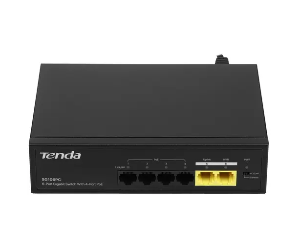 Коммутатор неуправляемый PoE Tenda SG106PC 6 портов, 6x1Гбит/с, PoE 4х до 30Вт, 2хUplink, настольный