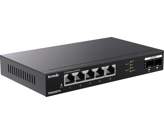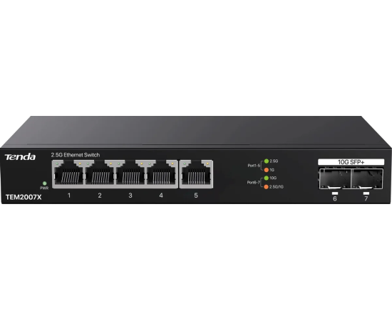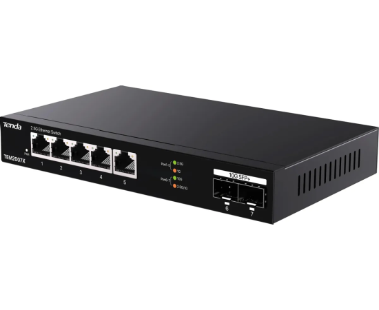 Коммутатор Tenda TEM2007X неуправляемый, 7 портов, RJ-45 5х2,5 Гбит/с, SFP+ 2х10 Гбит/с, настольный, металлический