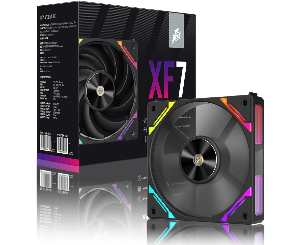 Комплект вентиляторов (3 шт.) 1STPLAYER XF7 Black (XF7-BK-3IN1) / 120mm ARGB 3pin 5V PWM 4pin 12V 600-2000rpm 56.8cfm 33.12dBA