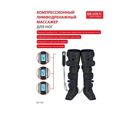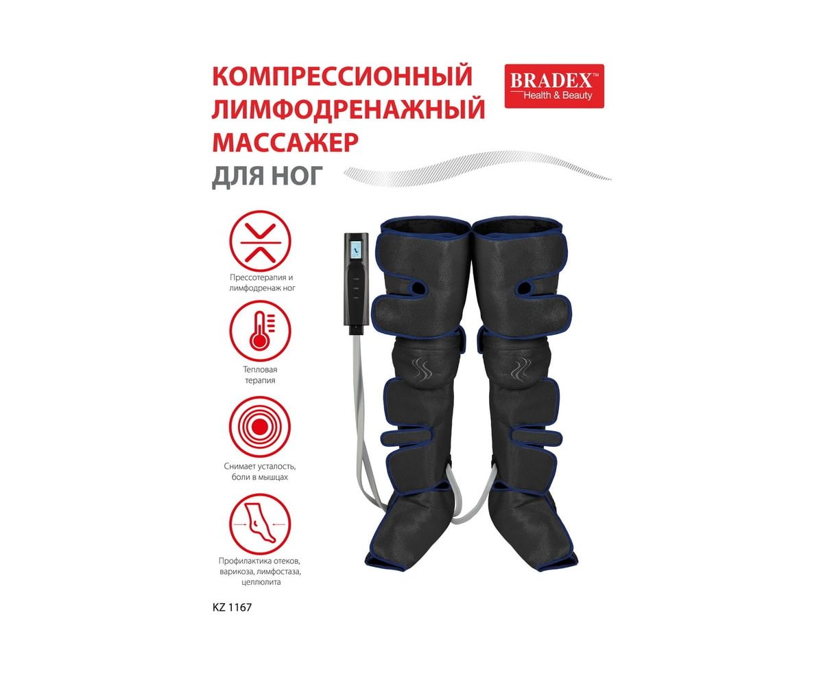 Компрессионный лимфодренажный массажер для ног BRADEX прогрев коленей, длинные манжеты, черный KZ 1167 – профессиональное устройство для проведения прессотерапии и лимфодренажа ног с дополнительной функцией подогрева в области коленей в домашних условиях.
