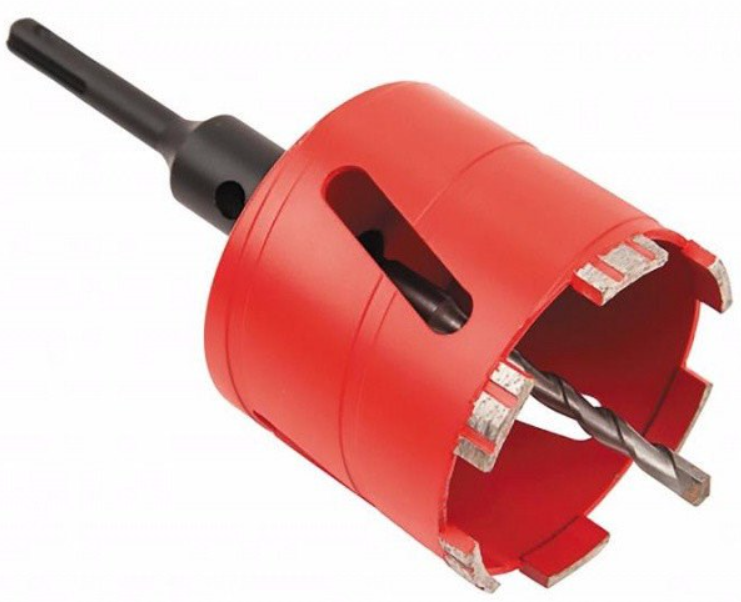 Коронка алмазная сегментная предназначена для сверления отверстий в бетоне, легко армированном бетоне и кирпиче ручной сверлильной машиной без подачи воды. Хвостовик - резьба М 16 внутренняя. Переходник SDS plus - М 16 и центровочное сверло в комплекте. Количество сегментов - 4 шт.