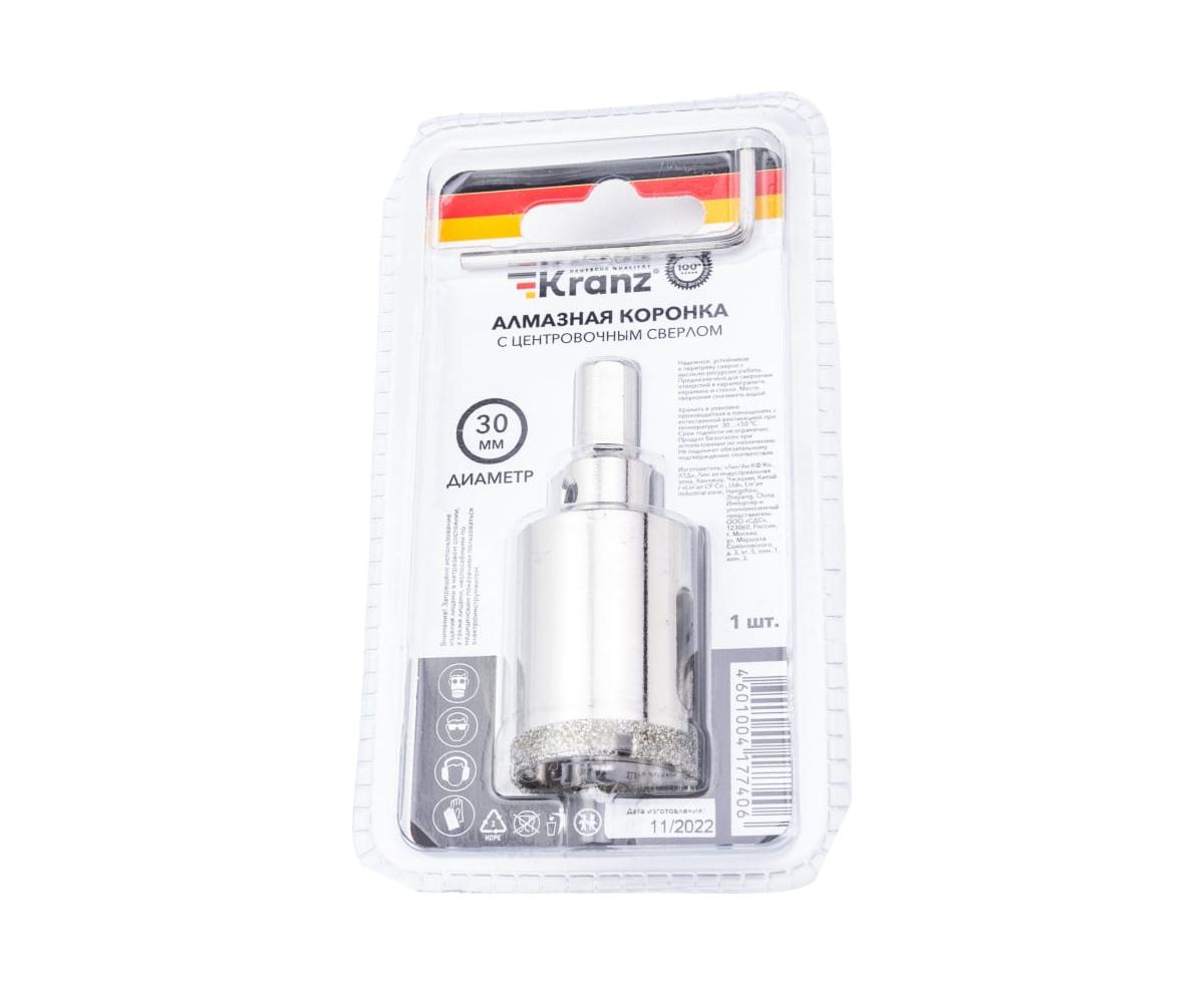 Коронка алмазная по керамограниту с центровочным сверлом KRANZ KR-92-0010 30 мм