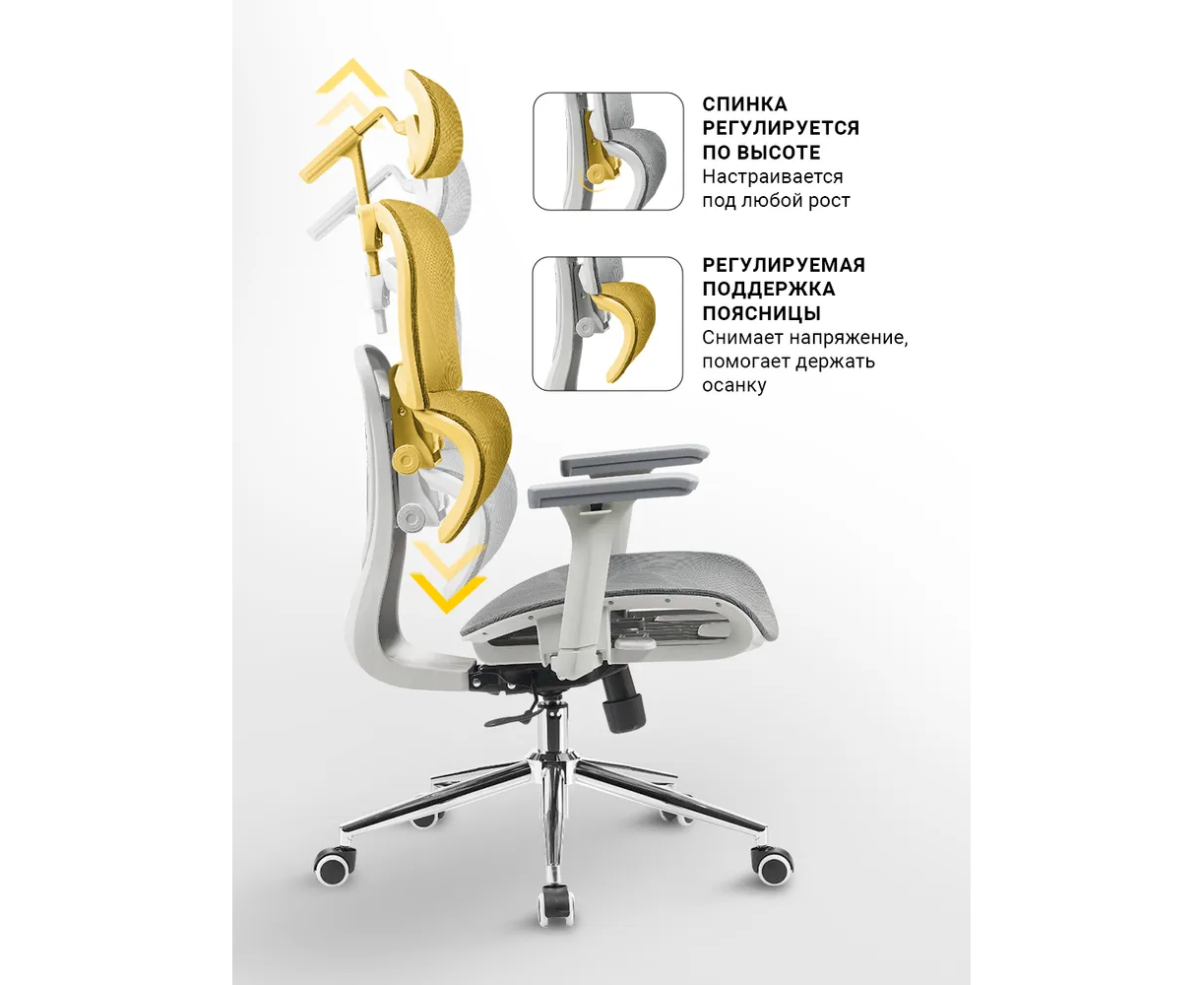 Регулировка: Угла наклона спинки, Глубины сиденья, Угла подлокотников, Высоты подлокотников, Высоты спинки, Высоты поясничного упора, Высоты подголовника, Угла наклона подголовника