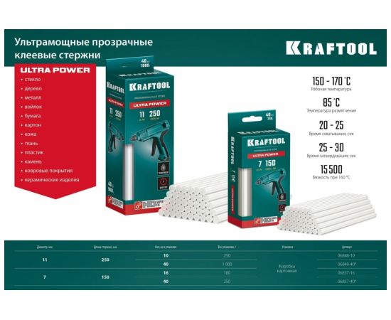 Кристально прозрачные клеевые стержни KRAFTOOL Crystal 40 шт, 11x250 мм 06846-40 - универсальные клеевые стержни со специальным составом обеспечивающим полную прозрачность клея после застывания.