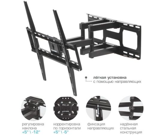 Особенности: Усиленная стальная конструкция, Универсальный-телевизор на кронштейне можно наклонить, повернуть и сдвинуть к стене, Широкая монтажная пластина обеспечивает надежное крепление ТВ на стену, Легкий монтаж телевизора, Корректировка экрана ±5°