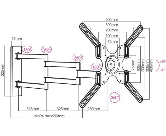 22"-55" Кронштейн Arm media LCD-900 black Наклонно-поворотный max 18 кг, 5 ст св., нак. ±20° пов. 180°, от ст. 94-990 мм., max VESA 400x400 мм.