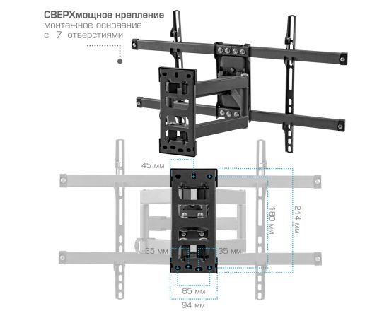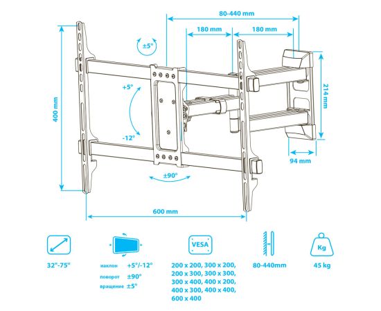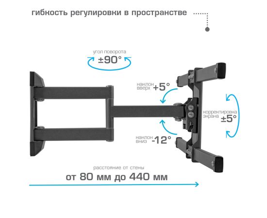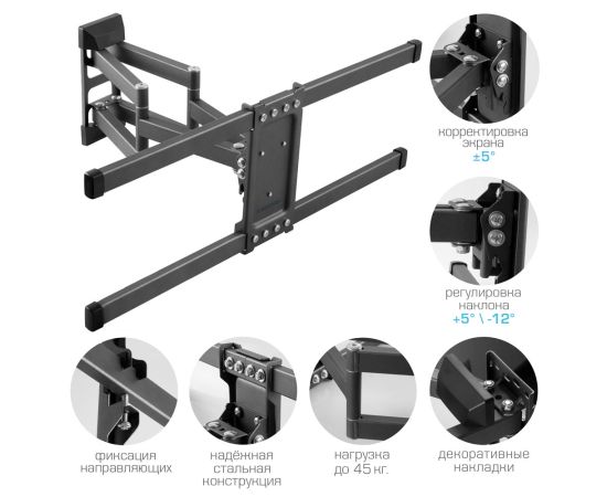 Надежная стальная конструкция максимальная нагрузка до 45 кг, Универсальная система крепления, Легкий монтаж при помощи съемной монтажной пластины, Вращение экрана уникальная возможность вращения экрана на ±5° относительно стены