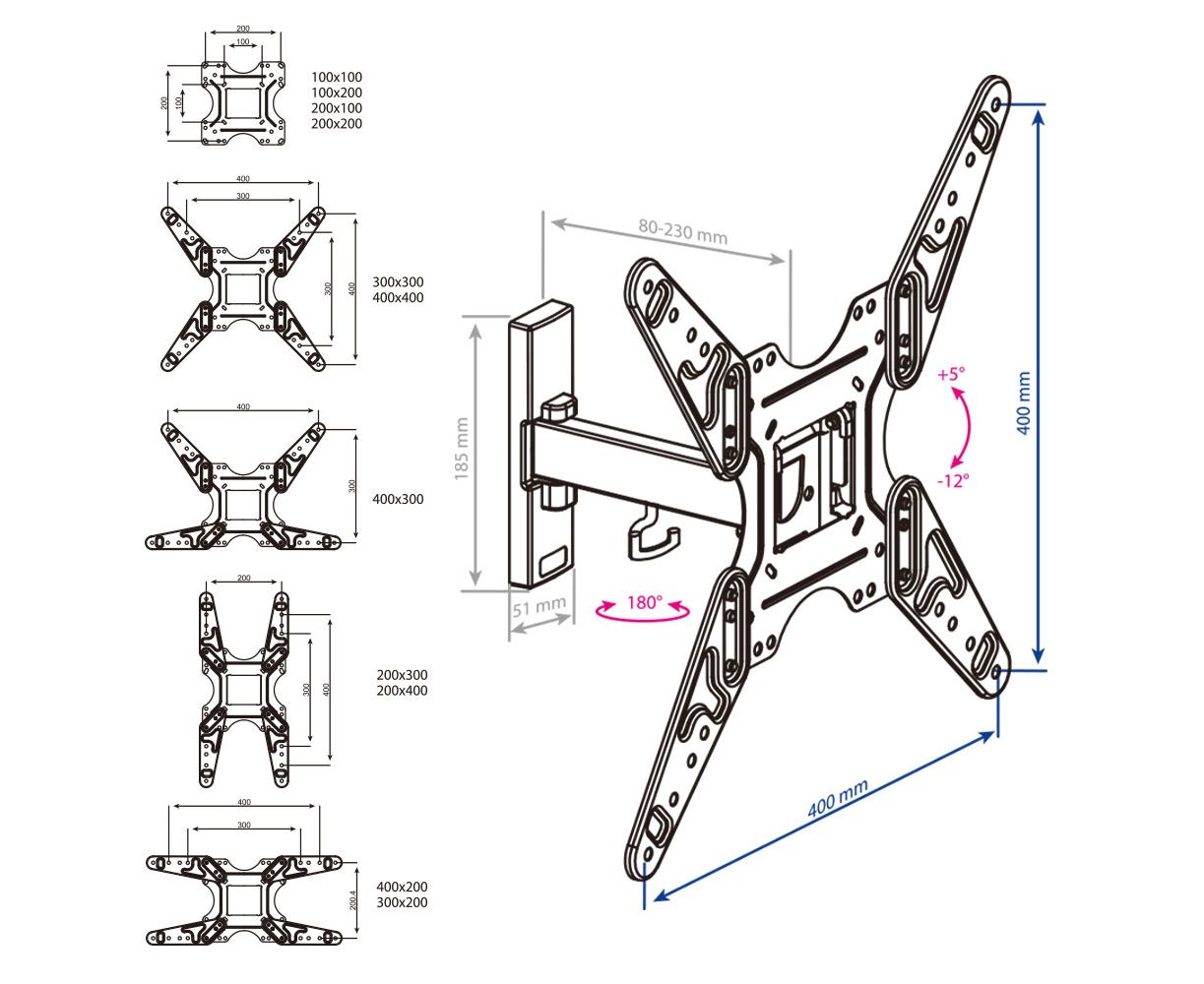 Крепежные отверстия (VESA): 100х100, 100х200, 200х100, 200х200, 300х200, 200х300, 300х300, 200х400, 400х200, 400х300, 400х400
