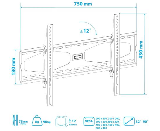 Стандарт Vesa: 100x100 мм, 200x100 мм, 200x200 мм, 200x300 мм, 200x400 мм, 300x300 мм, 400x300 мм, 400x400 мм, 600x400 мм, 75x75 мм