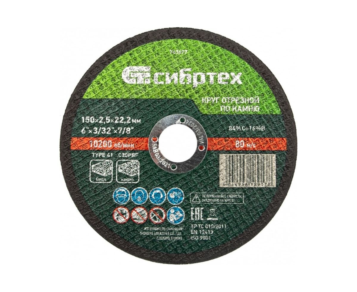 Круг отрезной Сибртех 743677 по камню, 150х2,5х22,2 мм, 84%C+16%B
