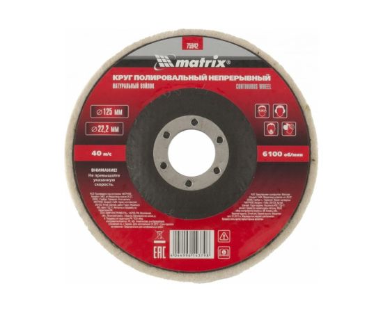 Непрерывный полировальный круг из натурального войлока Matrix 75942, 125 х 22,2 мм - оснастка для углошлифовальных машин, предназначенная для финишной отделки металлических, стальных, стеклянных, пластмассовых и других материалов. Круг эффективен при работе на плоских поверхностях и будет полезен на стройплощадке, в автосервисе, а также в домашней мастерской.