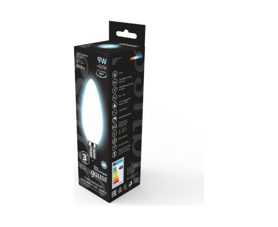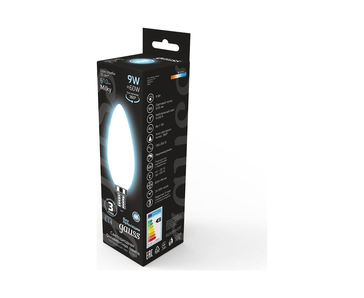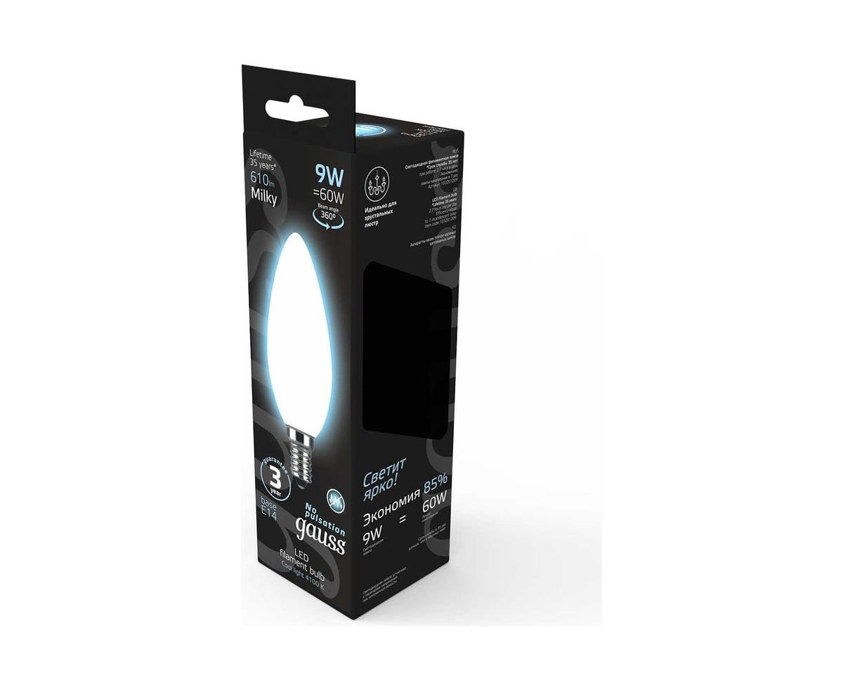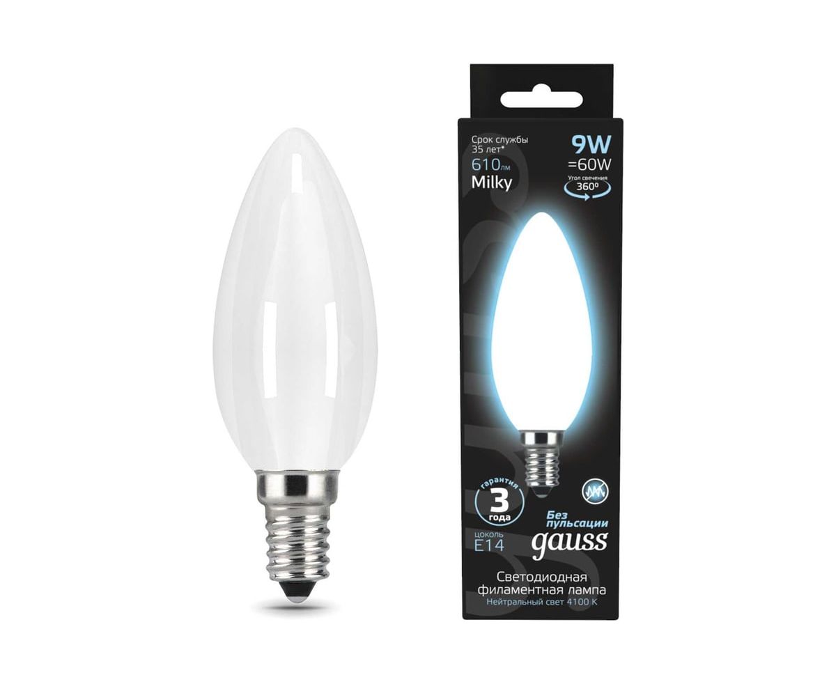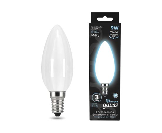 Технические характеристики Gauss Filament свеча, 9W, 610lm, 4100К, Е14, milky LED 103201209