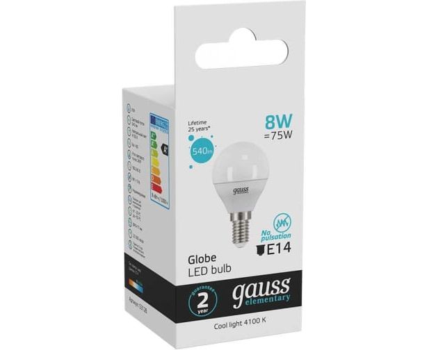 Лампа Gauss Elementary (53128) светодиодная 8Вт цок. E14 шар 220B 4100K св.свеч.бел.нейт. P45 (упак. 10шт)
