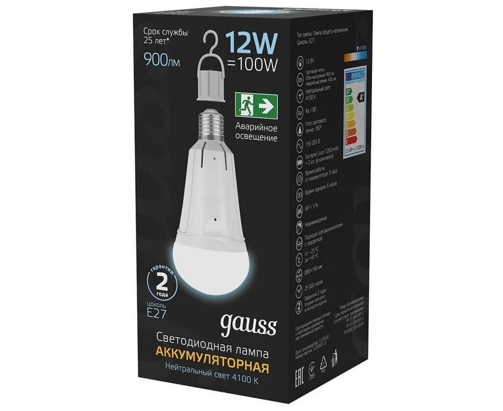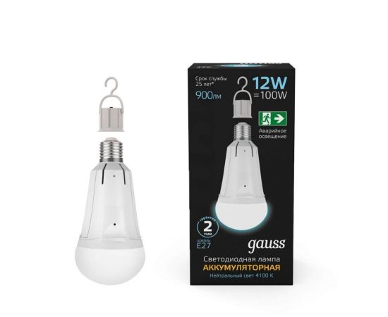 1.Аварийная лампа Gauss A80 12W 900lm 4100K Е27 с Li-Ion аккумулятором LED 1/5/50 102002212 продолжает работать при отключении электропитания.