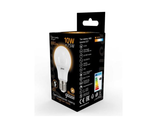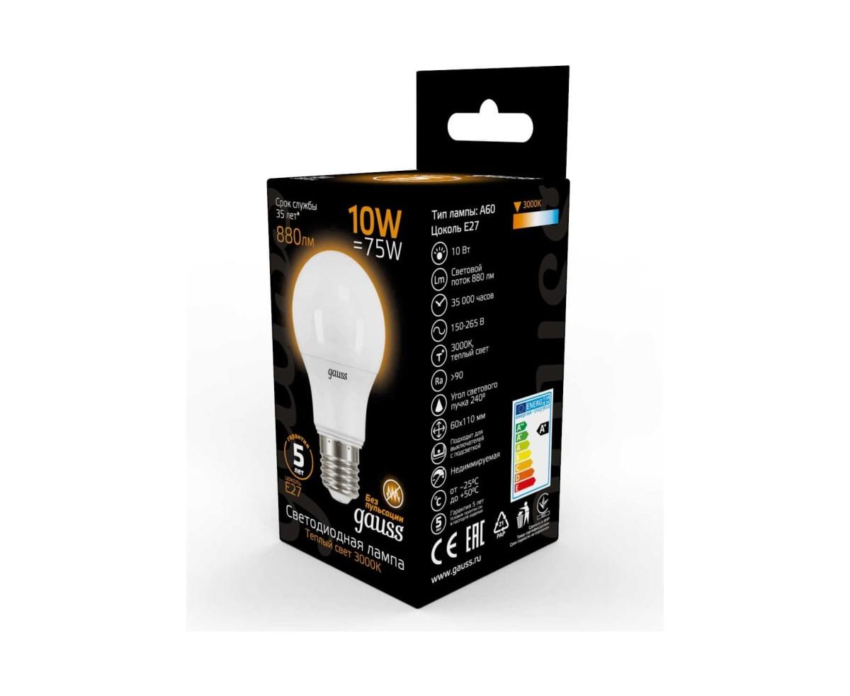 Технические характеристики Gauss LED A60 10W E27 880lm 3000K 102502110