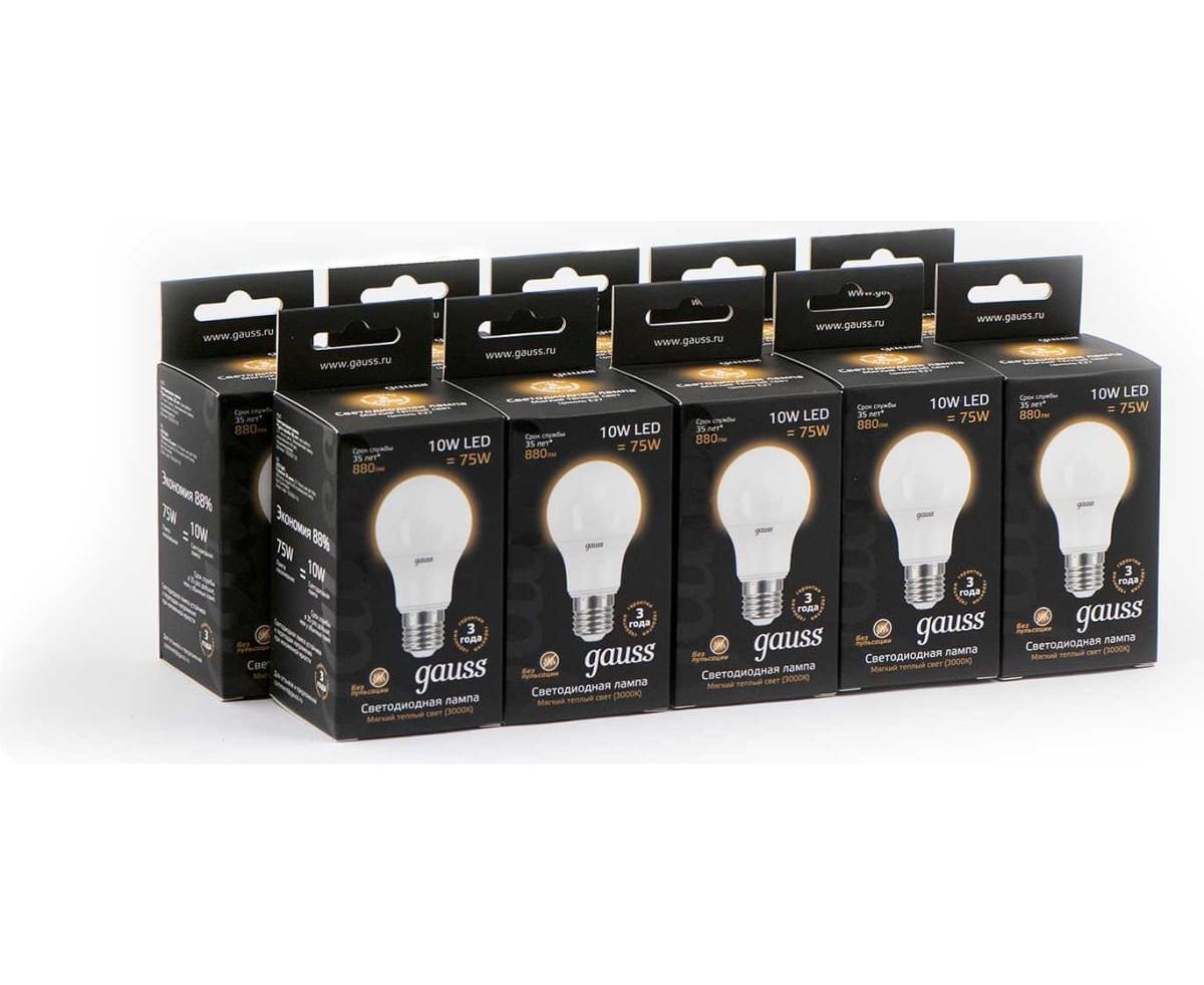 Лампа светодиодная Gauss A60 102502110 10Вт цок.E27 шар 220B 3000K св.свечения белый теплый A60 уп/10шт