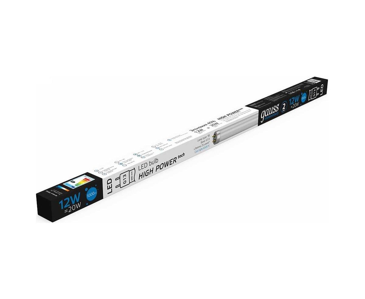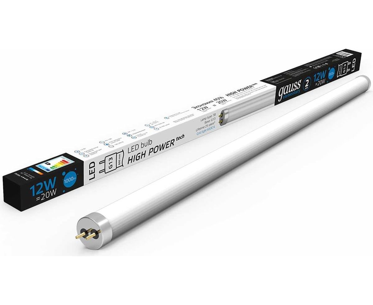 Лампа GAUSS Elementary T8, 12W, 1000lm, 6500K, G13, 600mm, стекло, LED, 1/20 93032 - выгодная замена стандартных люминесцентных ламп. Лампа имеет нормативную длину и без специальных доработок заменит люминесцентные лампы, поскольку устанавливается в стандартные светильники с патроном G13.