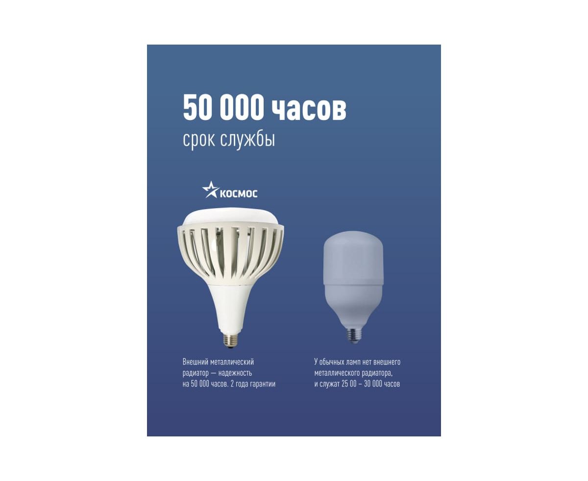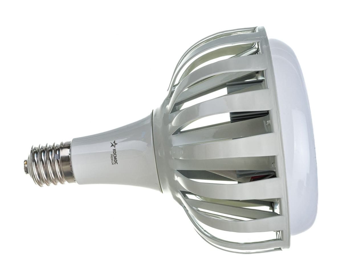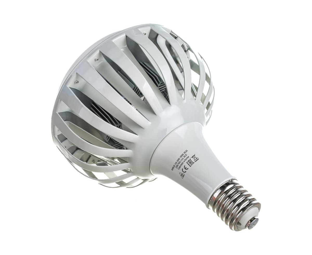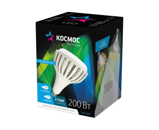 Светодиодная лампа КОСМОС PREMIUM HWLED 200W E40 6500K KHWLED200WE4065 идеальна для помещений с потолками 6-11 метров: на производствах и складах, в торговых центрах и гипермаркетах. Лампа дает на 30% больше света, чем аналогичные по мощности, за счет направленного угла освещения: весь световой поток идет в полезный свет, а не поглощается светильником. Установив такую лампу, вы получаете полноценный LED-светильник, но намного дешевле, - она подходит к любым отечественным подвесным светильникам, включая НСП. Качественный свет, как у бытовых ламп. Без пульсации и с высокой передачей цветов Ra>80. Подходит для освещения оборудования с движущимися деталями, где пульсация света недопустима. Устойчива к перепадам напряжения 176-264В. Служат до 50 000 часов. Внешний металлический радиатор обеспечивает надежное охлаждение и позволяет лампе отработать полный срок без сбоев. Лампа заменяет: КЛЛ 250Вт, ДРЛ 400Вт, ДРВ 750Вт