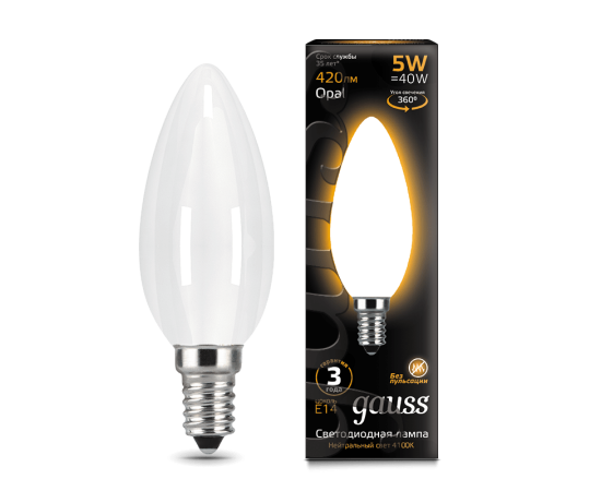 Наименование Лампа Gauss Filament Свеча 5W 420lm 2700К Е14 milky LED 1/10/50