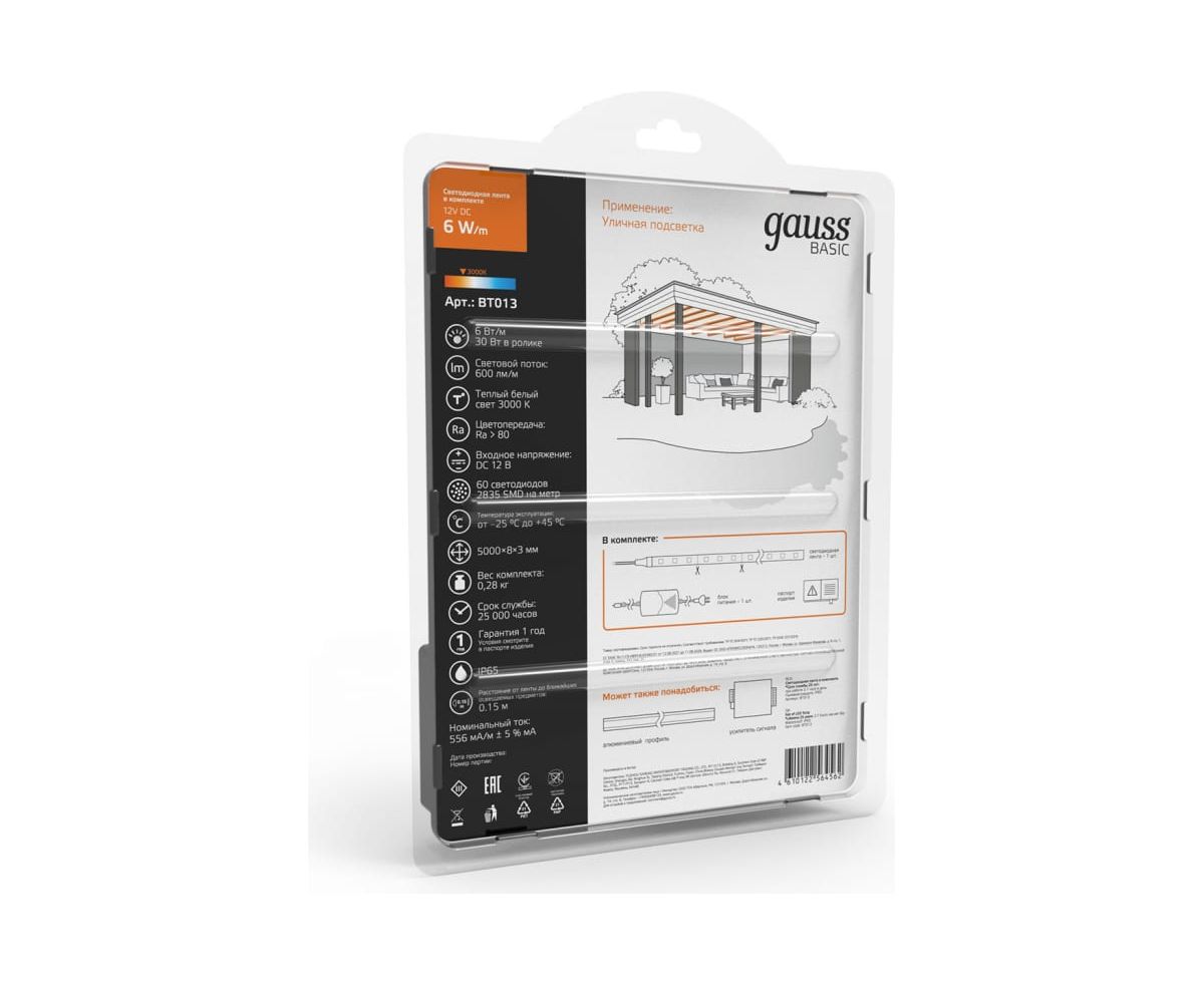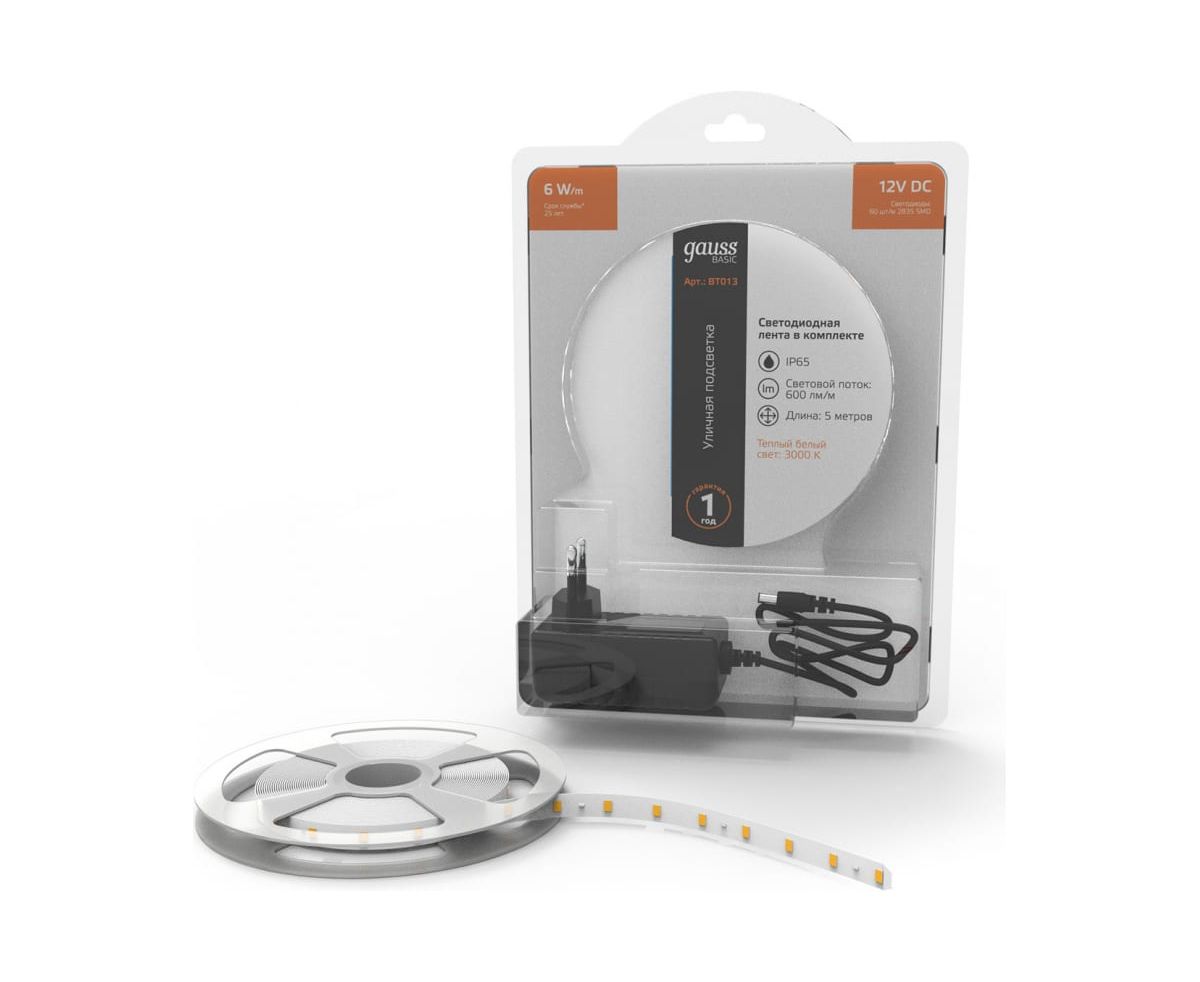 Лента Gauss Basic в комплекте 12V 6W/m 600lm/m 3000K IP65 LED 5m BT013 способна решить ряд задач связанных как с декоративным освещением помещений, так и с экстерьерной подсветкой.