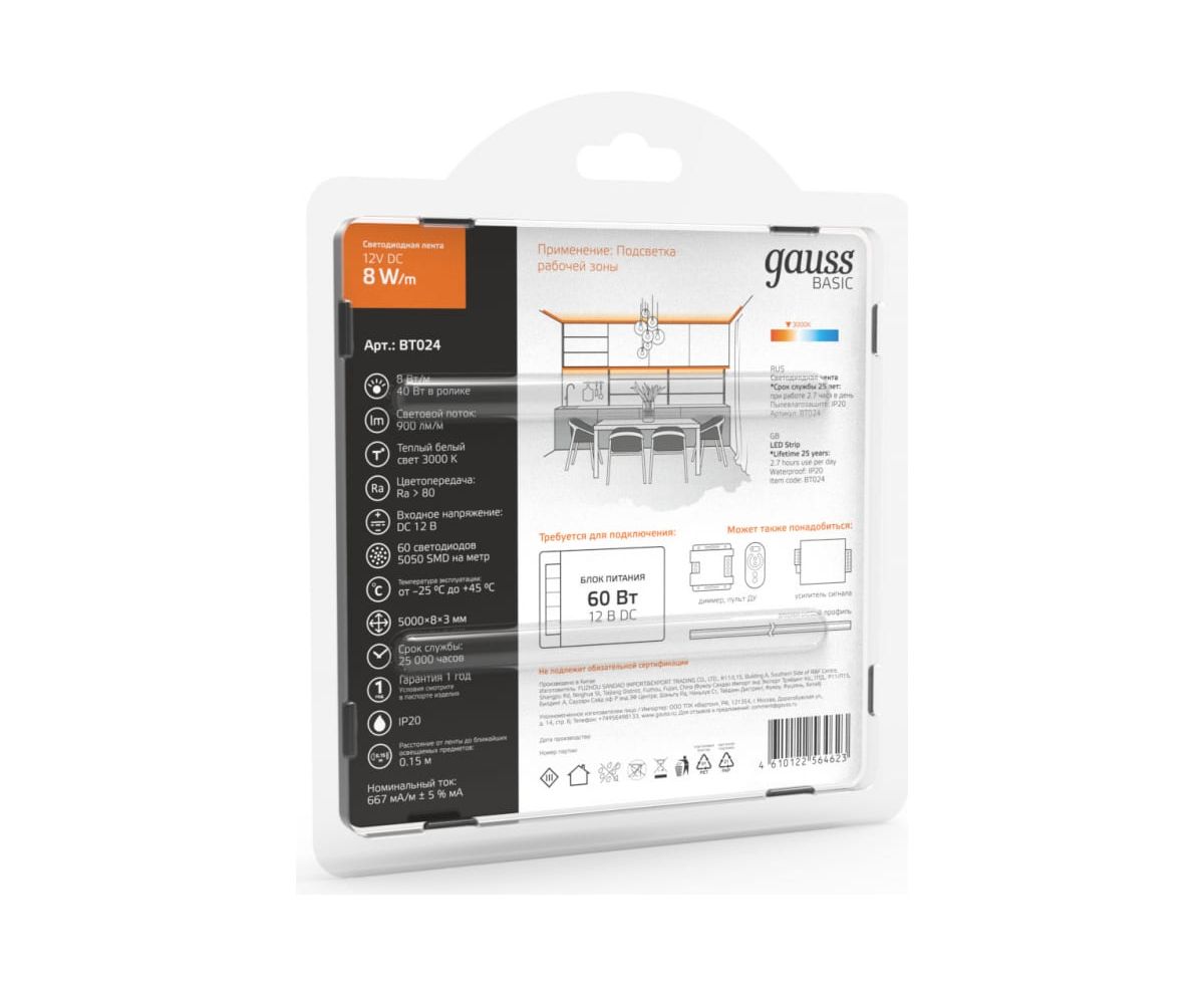 Лента Gauss Basic 12V 8W/m 900lm/m 3000K IP20 LED 5m BT024 способна решить ряд задач связанных как с декоративным освещением помещений, так и с экстерьерной подсветкой.
