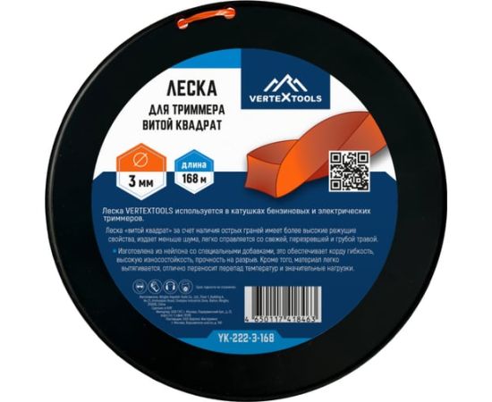 Леска 3 мм, бобина 168 м, витой квадрат для триммера vertextools YK-222-3-168