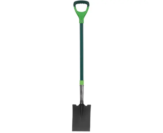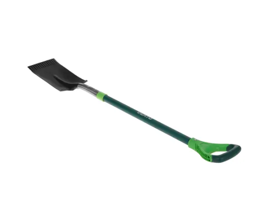 Лопата (прямой штык, черенок из стекловолокна) VERTO 15G004 используется для садовых и строительных работ.
