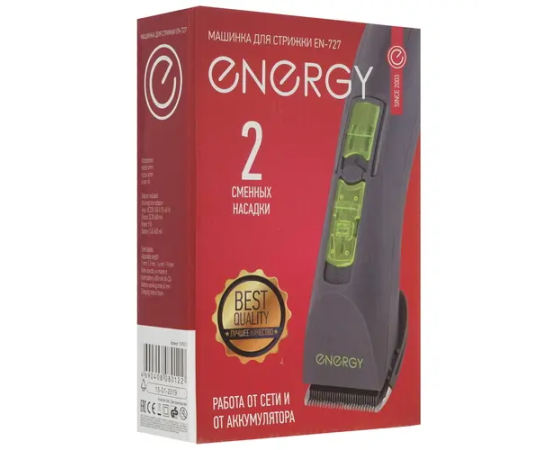 Машинка для стрижки ENERGY EN-727 обеспечивает качественные результаты стрижки и удобство в процессе эксплуатации. Настройка длины срезания выполняется за счет регулятора-рычага в пределах 1-6 мм и двух сменных насадок. Корпус эргономичной формы гарантирует комфортное удержание прибора. Машинка для стрижки ENERGY EN-727 работает на основе аккумулятора, одного полноценного заряда которого достаточно для 60 минут автономной работы. Для зарядки требуется около 6 часов. В наборе поставляются щетка для чистки, сетевой адаптер и масло для ухода за лезвиями.