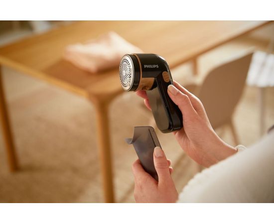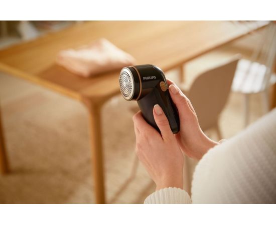 Лезвия вращаются со скоростью 8800 об/мин., что позволяет эффективно и быстро удалять катышки с одежды.